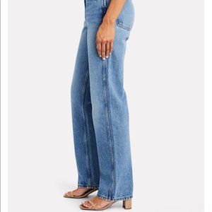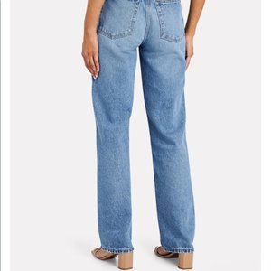 The label's 90s high-rise loose jeans are a vintage-inspired throwback style with a leg-lengthening straight-leg silhouette in their Broken Indigo denim. Belt loops. Zip fly and button closure. Five pocket styling.