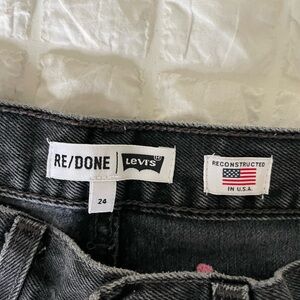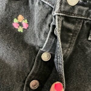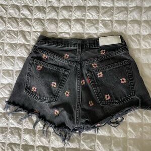 Chic black jean shorts with floral accents. Frayed hem adds edge.