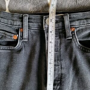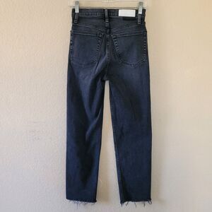 Classic straight leg jeans. Frayed hem. Button fly closure.