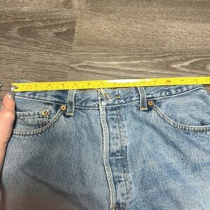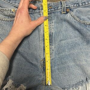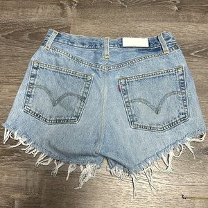 Re/done Levi’s blue jean shorts. Frayed edges. Five-pocket design. Button and zip front. EUC. Minor spots as shown in pics.