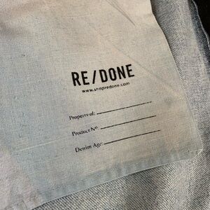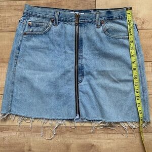 New with tags, reconstructed Levi’s denim skirt upcycled in the USA for Re/Done. Size 28. Zips open with heavyweight zipper, zippers added to relocated pockets. 100% cotton. Bold style.