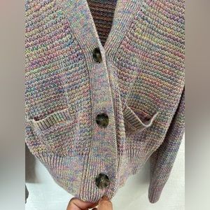 Condition is pre owned. No holes or stains. Long sleeve knit cotton and linen-blend cardigan in multicolor. Rib knit Y-neck collar, cuffs, and hem. Button closure at front. Welt pockets at waist. Cropped hem.Supplier color: Rainbow.
