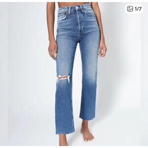 Gently used re/done 70s stovepipe distressed jeans. Straight jeans with a 70s-inspired look. Button fly with a ripped hole. Stretch.