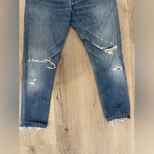 Excellent pre-owned condition. Still have tags from The Real Real. There are some small spots/stains and distressing shown in photos as these were re-done jeans.
