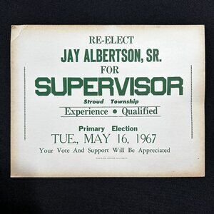 Re-Elect Jay Albertson Sr for Supervisor, Stroud Township PA, May 16 1967 14"x11"