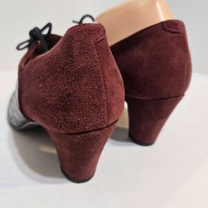 Quilted black leather pairs with burgundy colored smooth nubuch suede and a 2.5" heel to give the perfect retro vibe.