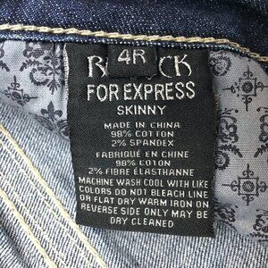Description: ReRock for Express women's skinny jeans in good preowned condition; low rise, stretch, hems have wear/fraying