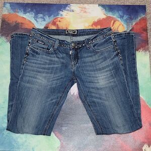 These are an amazing pair of rerock by express straight jeans. These have stitch design on back pockets. Metal garment tag plate on back waist. Button and zipper fly. These are in very nice condition and worn minimally - never dried in dryer. Factory distressing around the edges and whiskering.