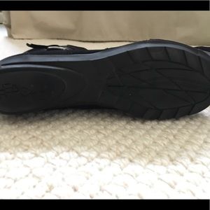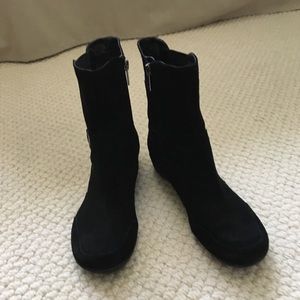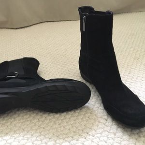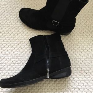 Move easily in this black suede ankle boot with side elastic panel; convenient side zip entry; comfortable fit; leather upper, man made lining, rubber sole; excellent condition!