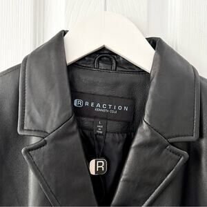 Size large from Reaction Kenneth Cole. New without tags. Has hang tag still attached. Vintage Y2K jacket. Black leather blazer style button up jacket with pointed collar. Front open waist pockets. Lined.