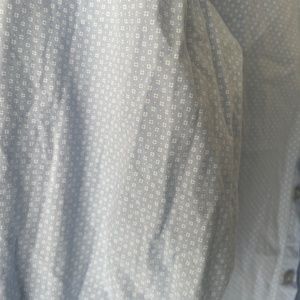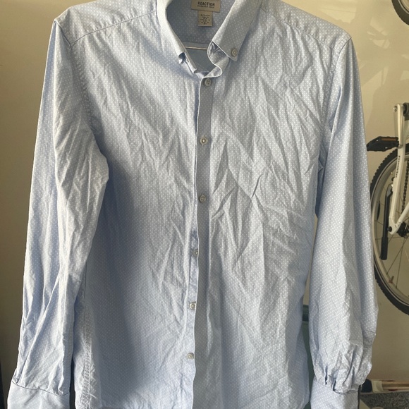 Light blue, long sleeve, button up shirt. No pocket. Great condition. Weight loss happened so it doesn’t fit anymore.