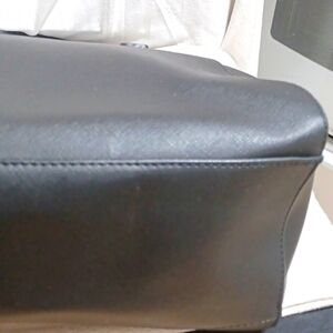 this is a beautiful reaction structured black bag by Kenneth Cole. This bag is in vegan leather and washable which is really nice. Has gold hardware on front where handles attach to bag. The logo is in center with REACTION on top of KENNETH COLE in gold. It has a black heavyweight tag hanging from right handle with gold small circle emblems for a really cute added touch. Top has gold zipper with black leather pulley. The back sides and bottom are prestine. Inside has zipper pocket with logo on one side and 2 open pockets on other side. Measurements of this bag are width 13 to 15" across height 11" depth 5.5-6". from handles to bag measures 8". in excellent condition makes a great everyday bag!! and is structured for everyday use!! Like new!!!