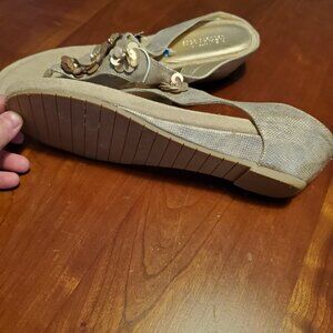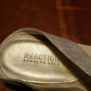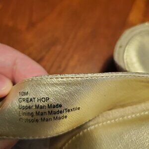 Gold upper with sparkle floral embellishment. Comfort footbed. Right shoe has faded tag from Ross. Never worn, but toss around in the closet. Man Made materials. Size 10 M Womens. Brand: Reaction by Kenneth Cole.