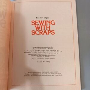 Up for sale is a vintage 1976 Reader's Digest Sewing with Scraps booklet. It is 32 pages long and it is packed with information. There are dozens of projects for home, children, holidays, and gifts-all using scraps that you have sitting around from past projects. This is a handy little booklet that helps us save money and have fun at the same time. The contents include: Grab-bag purse, Hot-pot mitt, Wall hung Magazine rack, Napkins and placemats, curler bag, macramé pot hanger, braided wreath, log tote, tailormade jewel case, tray holder, wall organizer, tennis racquet cover, pajama-bag turtle, needlepoint case, appliqued pillow, scarves, hats, halters, merry Christmas ornaments, frame in a fabric tooth fairy pillow, hand puppets bookmark, coasters and trivet doll's clothes, flowerpot cover.