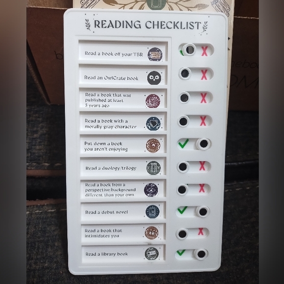Interactive reading checklist board with various book challenges. Features checkboxes for tracking progress.