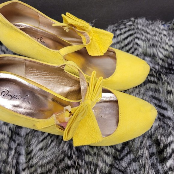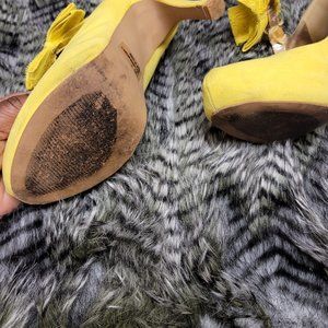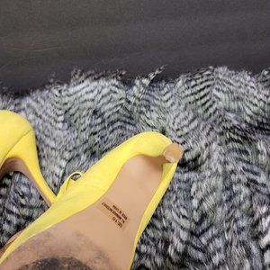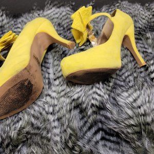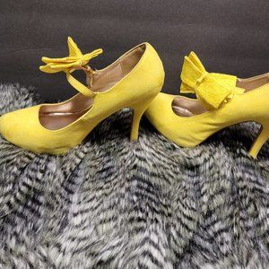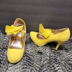 Spring into summer with these slightly used yellow pumps. Very stylish with a lace bow on the side. They bring out any spring or summer dress.