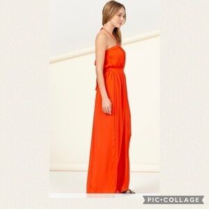 Absolutely Gorgeous! Blood Red Jumpsuit. Strapless - has ties around neck & in back. Pants flow, has elastic back of pants. Small band upper waist. Fully lined. 98% Poly 2% Spandex. Material like organza