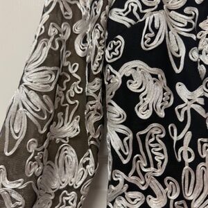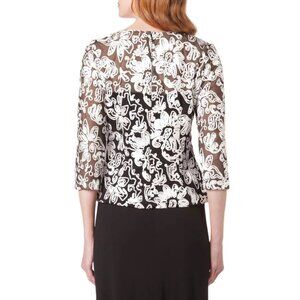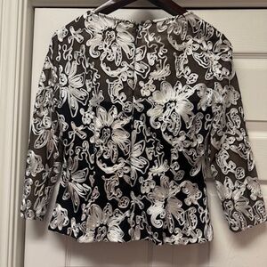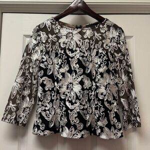Classic soft mesh top with contrasting soutache trim throughout and sheer illusion yoke/sleeves. Hidden back zipper, self and lining 100% polyester. Inner yoke and sleeves 80% nylon, 20% spandex. Black/white. Size Small. Worn twice. Popular top that Von Maur brings back every year for $149. Better than new.