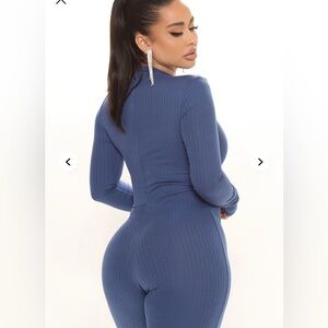 Elevate your style with this chic blue ribbed jumpsuit. Perfect for any occasion, it offers both comfort and elegance.