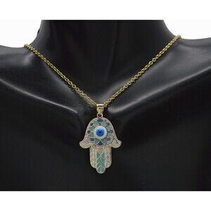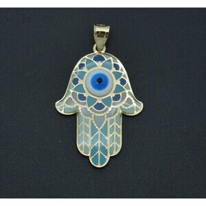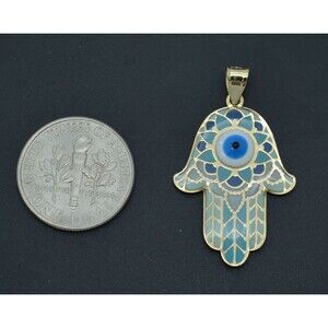 Real 14k Yellow Gold Ocean Blue Enamel Hamsa Evil Eye Pendant + 18" Chain
