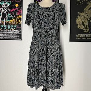 Real American vintage black with and blue floral dress with textured feeling fabric. Shoulder pads. Size 8. Made is the USA. Brand-Connected. #friends #vintagedress #90sdress
