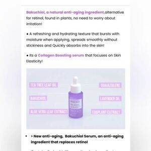 Advanced Special treatment formulated with Bakuchiol, a natural anti-aging ingredient, alternative for retinol, found in plants, no need to worry about irritation. Its a collagen boosting serum that focuses on Skin Elasticity. Apply after toner, spreads smoothly without stickiness and quickly absorbs into the skin. 10% photo- retinol firming booster. Vegan. 1.01 oz made in Korea