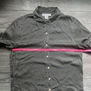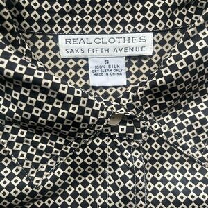 Real Clothes Saks Fifth Avenue button up shirt. Black and cream diamond print. Long sleeves. 100% silk. Size S. Previously owned.