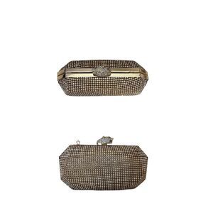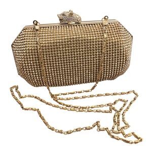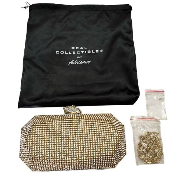 Real Collectibles by Adrienne Gold Rhinestone Clutch with Removable Strap With Dust Bag Gold-tone hard-case clutch with all-over rhinestone mesh, which is in perfect condition. Panther clasp. Shoulder chain is attached and measures about a 21" drop. Interior is one space, lined in black with brocade seams: no interior pocket and measures a little over 5" long.