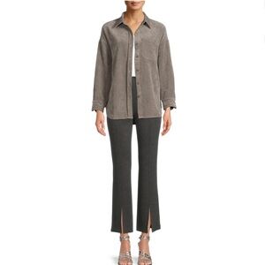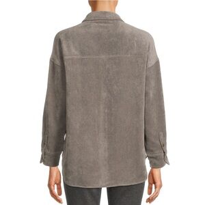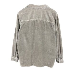 Classic vintage stripe corduroy button-up shacket in a neutral taupe shade. Features a single front pocket and a traditional collar. Stock photo is similar reference.