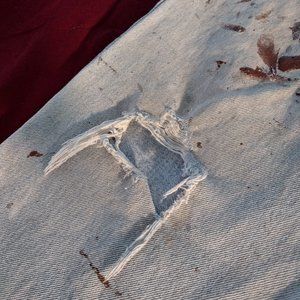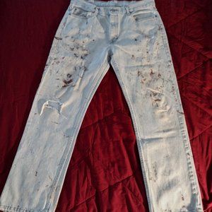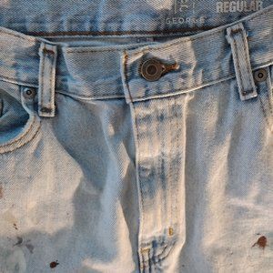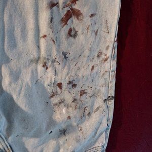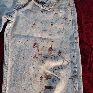 Worn, torn (on right knee), and stained with at least 3 colors of paint & stain. Zips great.