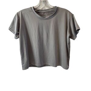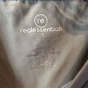 Keywords: Real Essentials, women's T-shirt, cropped style, gray, size small, short sleeve, polyester, spandex, machine washable, pre-owned, excellent condition.