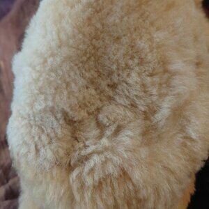 Unbranded, thick, fluffy in classic bucket style, lined in white terry cloth. Brand new, never worn. Measures 22" circumference, 7" tall.