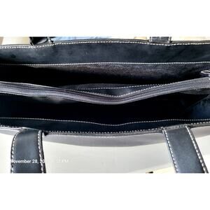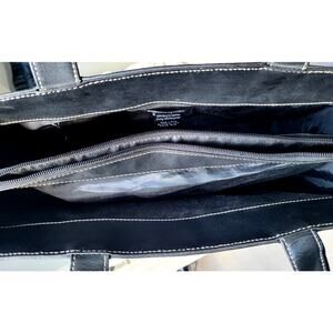 Clean inside and out, zippers work as they should, fully lined, shoulder/hand straps. Nice patina, white stitching on black leather. A zippered compartment separates two side compartments where papers, shoes and a laptop would fit. A smaller side zippered pocket as well. Leather and interior are in great shape, metal grommets on the bottom show wear. A well structured bag that will not fall over when placed on a surface.