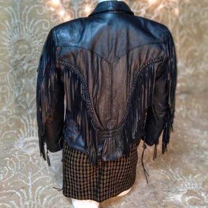 Edgy real leather jacket with trendy hanging fringe. Thick material. Silk interior coating.