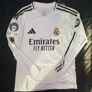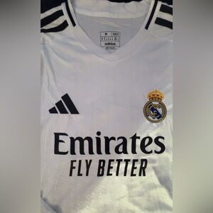 Brand new with tags, comes in original bag. Official Real Madrid 24/25 home jersey, long sleeve edition with Mbappé’s #9 on the back. Features authentic heat pressed details and modern design. Perfect for collectors and fans looking to celebrate Mbappé’s debut season at Madrid. Size M Ships fast!