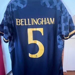 Classic 2023/24 Real Madrid away jersey starring Jude Bellingham in the back who had a season of a life time being their talisman who ended ip winning them their 15th champions league title in a thrilling 2-0 victory vs dortmund