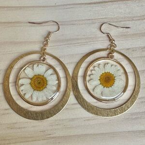 Real Pressed Daisy Resin Earrings in Gold Tone Circles 🌼