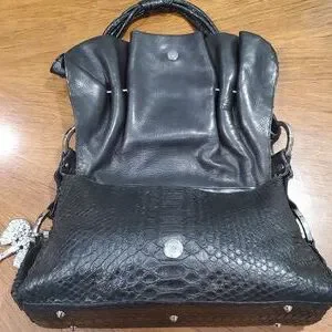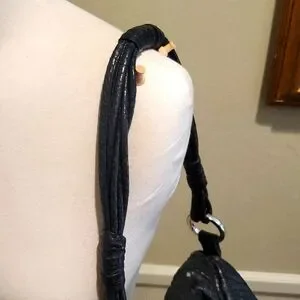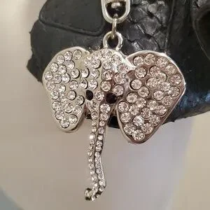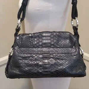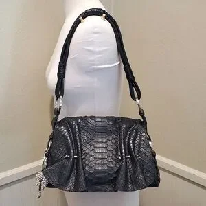 Gorgeous black shoulder bag by Retta Wolff. Made of realpyrgon, bag is soft and supple. top flap has rhinestone barbell "piercings". Has rhinestone elephant Keychain for some added bling. Bag is in excellent condition. I wouldn't say it looks new, but no flaws that I can find either.