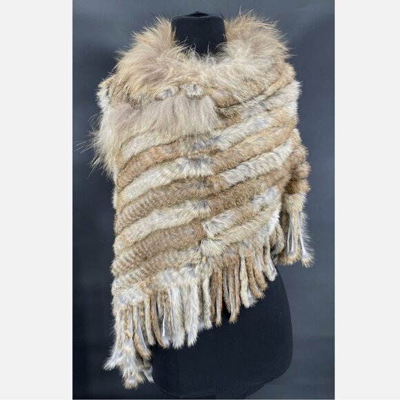 Real Rabbit & Raccoon Fur Knitted Poncho Shawl Stole Coverup Tassel Fringe OS