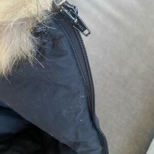 Real raccoon fur hood with zipper and draw strings. The fur is soft and fluffy. The zipper is 19 inches from end to end.