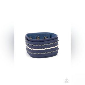 Three rows of gray and white cording are laced down the center of a blue leather band that is studded in place across the front of a thick blue leather band, resulting in a rustic pop of color around the wrist. Features an adjustable snap closure.