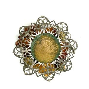 Elegant roses pendant featuring intricate burgundy, green and creamy hues. Vintage, handcrafted and truly one of a kind. Pendant only, the chain is not included. It measures approximately 1-7/8” and features a bail sized for chains, ribbons or cords. The patina on the back is expected due to age and wear. Perfect for adding a touch of nature-inspired beauty to any outfit.