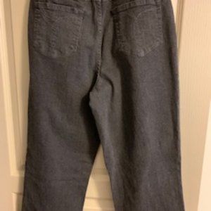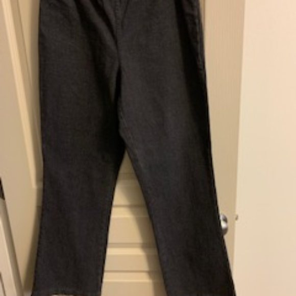 New black washed look jeans, bootcut 30" inseam. QVC size M, 96% cotton 4% spandex. No side pockets, less bulk and great back pockets.