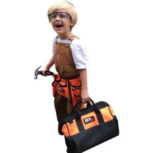 🧿11 PIECE STEEL FORGED TOOL SET – My First Tool Set by DIY Jr. includes: Professional Grade Child’s Hammer, 6” Combination Pliers, 6” Crescent Wrench, 10’ Tape Measure, 6” Needle Nose Pliers, 1.5” Phillips Head Screwdriver, 1.5” Flat Head Screwdriver, 9” Professional Level, Child-Sized Safety Glasses, Handy Child-Sized Tool Bag, and a Riveted Child-Sized, Adjustable Tool Belt.