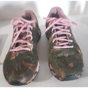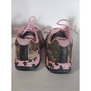 These women's RealTree athletic shoes in size 10M feature a lace-up closure, pink, and camouflaged pattern, with a mid-top sneaker style. The shoes are cushioned, breathable, and offer comfort for activities like walking, running, and training. Made with a mesh upper and rubber outsole, they are suitable for outdoor occasions in various seasons. The shoes bear the RealTree brand and are branded as "Tree Girlls." As you can see in photos, it has atear on the inside heel. As with any used item except signs of wear and tear. Please look at photos carefully to see the defects on the back heel inside shoes.
