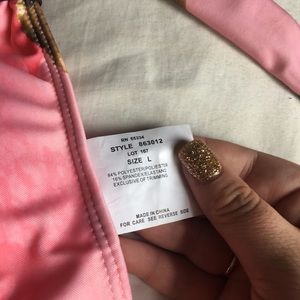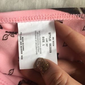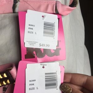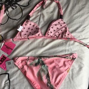 Pink camo bikini swimsuit, never worn, tags still attached. Runs slightly small. Has studded leather on hips and blinged part on top straps.