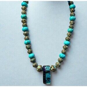 Real Turquoise Inlay & Silver Beaded Necklace W/ Dichroic Art Glass Pendant