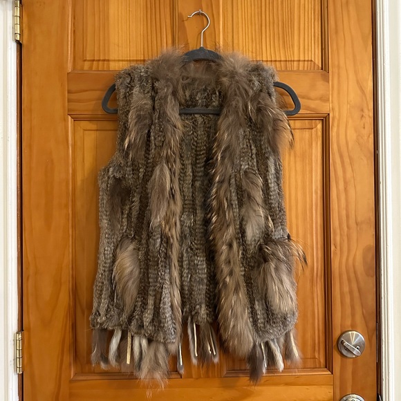 G.W.B.G vest made of real rabbit and raccoon fur. Features slight fluff along the collar, fringe- like detailing on bottom, and texture throughout. Extremely soft and in great condition. A few of the “fringe” strips are missing but it’s hard to tell.