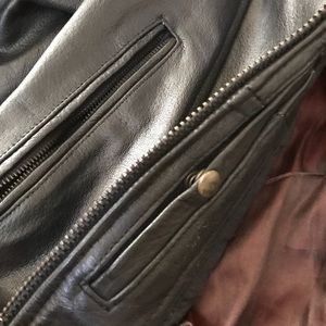 Real leather biker / Motorcycle jacket w /removable liner. Maroon Satin thermal Liner can be zipped in to the jacket and has buttons to secure it stays in place with opening for pocket accessibility. Jacket has tailored waist with adjustable buckles on the side and zip up wrist. Well vented too. This is a very sturdy/ heavy jacket a true motorcycle jacket. Two inside pockets and 2 outside pockets. If you have any questions please let me know. Thanks