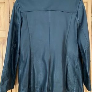 Alfani black real leather lined jacket. Straight fit. Great shape. A little faded on collar but otherwise condition is very very good. Great Fall and Spring jacket